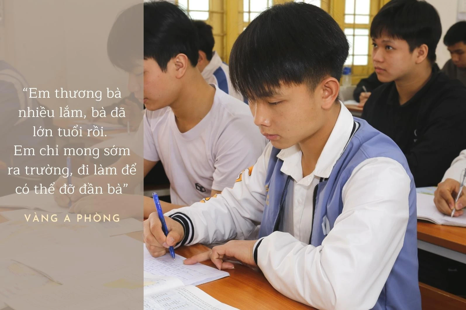 Vàng A Phòng, ở xã Cốc Mỳ (huyện Bát Xát), sinh viên năm thứ 3 lớp cơ khí động lực, Trường Cao đẳng Lào Cai mồ côi cả cha lẫn mẹ khi chưa tròn 1 tuổi. Vì thế, Phòng không được cảm nhận tình mẫu tử và hơi ấm yêu thương của cha, mà chỉ nhờ sự yêu thương chăm sóc của bà nội. Hằng ngày, bà của Phòng trồng rau mang ra chợ bán lấy tiền lo cho cháu ăn học. “Em thương bà nhiều lắm, bà đã lớn tuổi rồi. Em chỉ mong sớm ra trường, đi làm để có thể đỡ đần bà” - Phòng tâm sự.