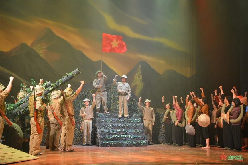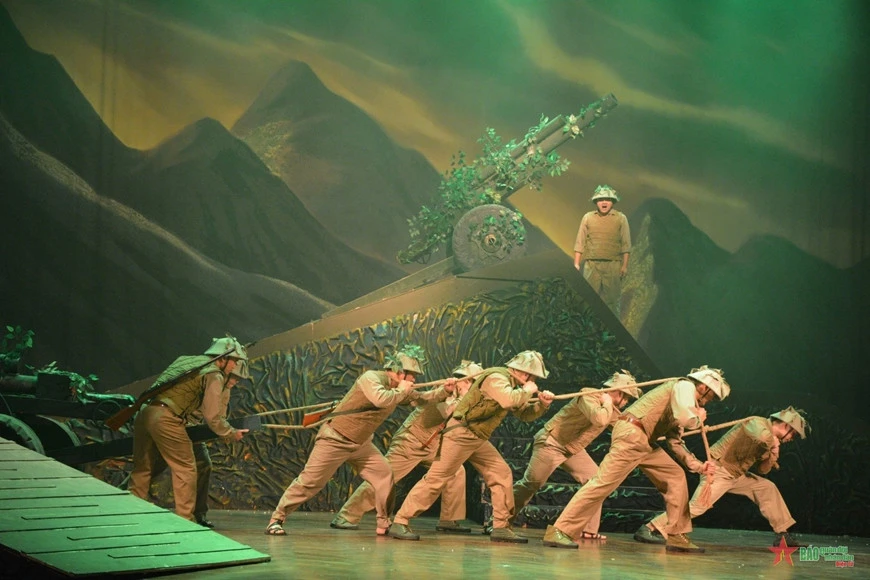Phân cảnh Đại tướng Võ Nguyên Giáp cùng bộ đội và dân công hô vang quyết tâm chiến thắng.