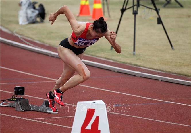 VĐV Quách Thị Lan xuất phát chạy chung kết 400m vượt rào nữ tại SEA Games 31. Ảnh: Quốc Khánh/TTXVN
