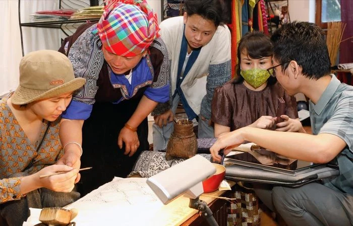 Chị Lý Thị Ninh (thứ 2, từ trái sang) hướng dẫn vẽ sáp ong trên vải lanh truyền thống của người Mông ở Chế Cu Nha tại không gian Craft Link, 51 Văn Miếu, Hà Nội.