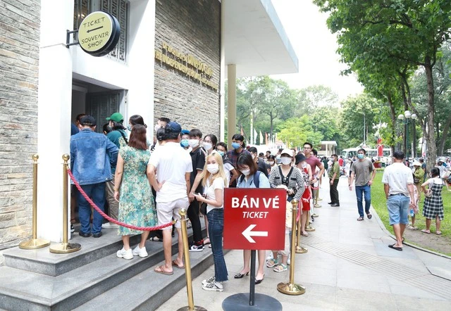Du khách xếp hàng mua vé tham quan Dinh Độc Lập.