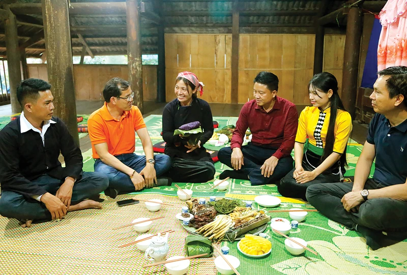 Giới thiệu với du khách về ẩm thực truyền thống của người Tày ở xã Dương Quỳ.