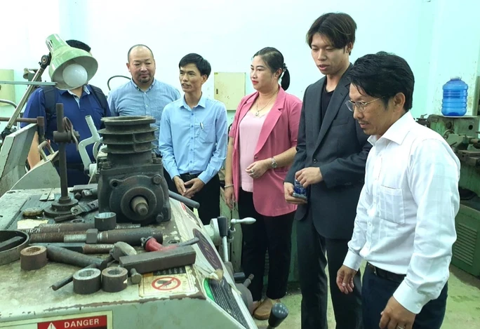 PGS.TS. Vũ Thị Phương Anh, Hiệu trưởng Trường Cao đẳng Quảng Nam (ở giữa) giới thiệu cơ sở vật chất đào tạo ngành cơ khí của trường.