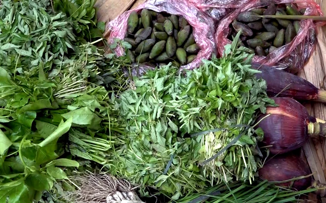 Các loại rau rừng được bày bán tại chợ phiên Nà Hẩu.