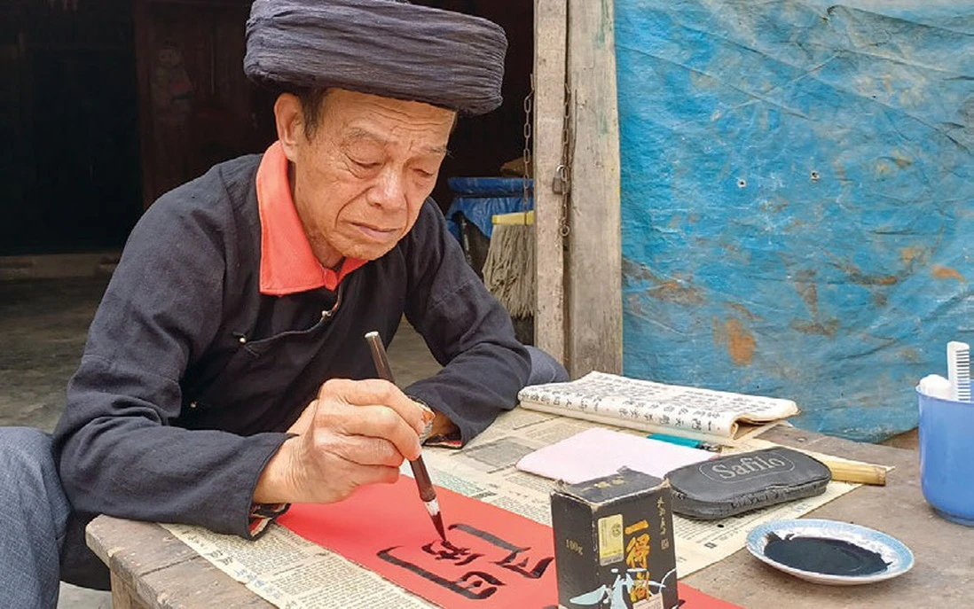 Nghệ nhân ưu tú Tẩn Vần Siệu (ở Tả Phìn, Sa Pa,Lào Cai) viết câu đối ngày tết.