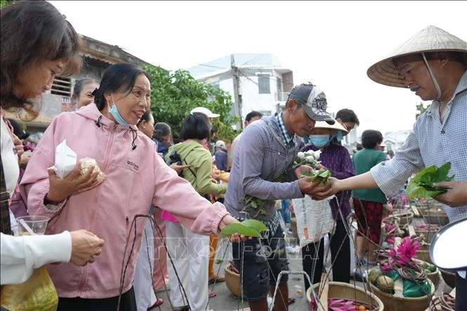Tham gia phiên chợ lá, nhóm của chị Nguyễn Thị Ngọc Thanh (56 tuổi), Lưu Thị Hương (61 tuổi) đến từ huyện Bình Chánh, Thành phố Hồ Chí Minh đã chuẩn bị hơn 400 phần gồm các món chè, xôi. Nhóm mong muốn chia sẻ với những người có hoàn cảnh khó khăn và truyền đi thông điệp khuyến khích mọi người luôn biết yêu thương, san sẻ với nhau, không bị lệ thuộc vào vật chất. Theo chị Lưu Thị Hương, việc cho đi vốn không phải là điều khó, chỉ cần một chút tâm thiện, chuẩn bị những món ăn đơn giản là đã có thể lan tỏa niềm vui, san sẻ khó khăn cho rất nhiều người. Do đó, phiên chợ lá được tổ chức hàng năm để khuyến khích mọi người sẵn sàng cho đi và lan tỏa sự thiện lương để làm đẹp thêm cho cuộc sống.