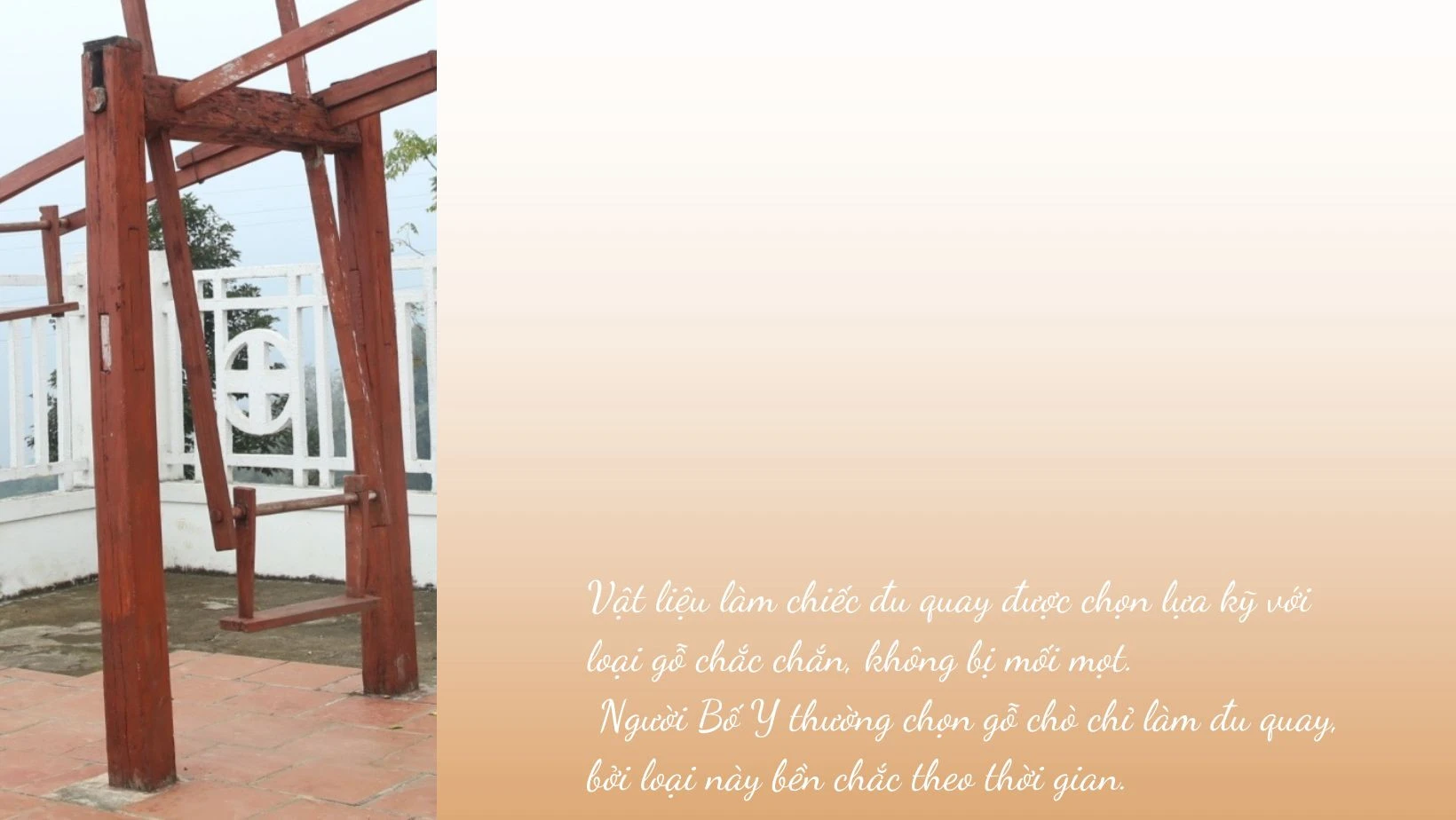 Chiếc đu của người Bố Y quay tròn, có thể đủ chỗ cho 4 người chơi. Vật liệu làm chiếc đu quay được chọn lựa kỹ với loại gỗ chắc chắn, không bị mối mọt. Người Bố Y thường chọn gỗ chò chỉ làm đu quay, bởi loại này bền chắc theo thời gian. Theo các cao niên trong cộng đồng người Bố Y, trung bình phải mất hơn 1 tuần mới hoàn thành được chiếc đu quay. Riêng công đoạn lên rừng tìm gỗ là mất thời gian nhất. Gỗ được đem về bản, công đoạn cưa, bào bắt đầu. Người làm đu quay cũng phải giỏi tính toán, sao cho độ dài của 4 thanh gỗ bằng nhau, điểm giao nhau giữa 4 thanh gỗ phải đảm bảo khi 4 người ngồi lên có thể quay tròn.