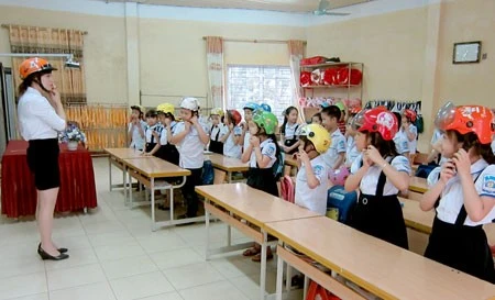 Cô và trò Trường Tiểu học Nguyễn Trãi trong giờ học ngoại khóa về an toàn giao thông và hướng dẫn cách đội mũ bảo hiểm đúng cách, an toàn.