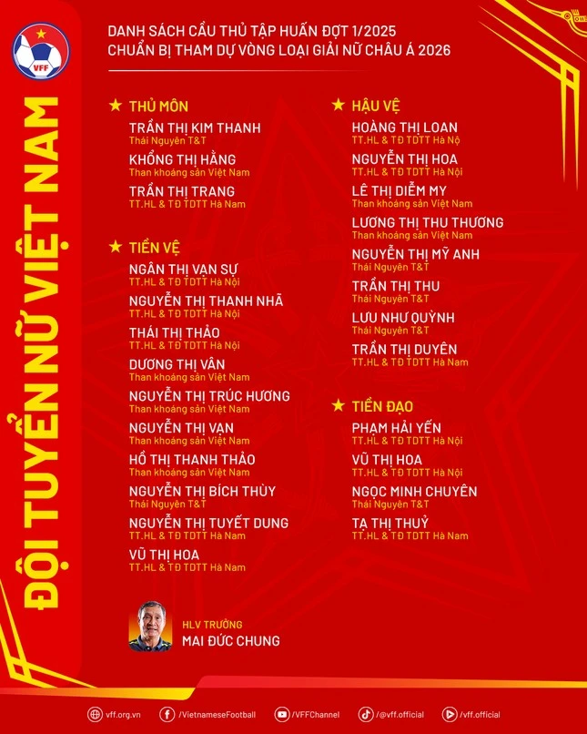 Dưới sự dẫn dắt của HLV kỳ cựu Mai Đức Chung, danh sách triệu tập lần này gồm 25 cầu thủ đến từ nhiều địa phương, đã được Cục Thể dục Thể thao phê duyệt.