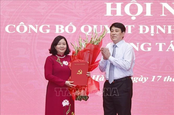 Đồng chí Lương Cường, Ủy viên Bộ Chính trị, Thường trực Ban Bí thư trao Quyết định của Bộ Chính trị phân công đồng chí Bùi Thị Minh Hoài giữ chức Bí thư Thành ủy Hà Nội nhiệm kỳ 2020-2025. Ảnh: Doãn Tấn/TTXVN