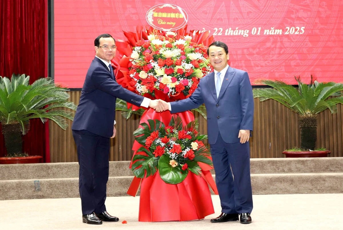 Chủ tịch Tổng Liên đoàn Lao động Việt Nam Nguyễn Đình Khang tặng hoa chúc mừng Bí thư Tỉnh ủy Hầu A Lềnh.