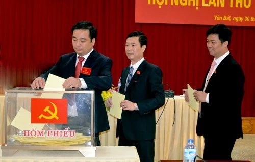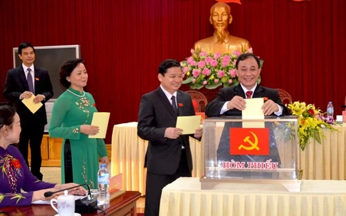 Các đồng chí Ban Chấp hành Đảng bộ bỏ phiếu bầu các chức danh Bí thư, Phó bí thư Tỉnh ủy.