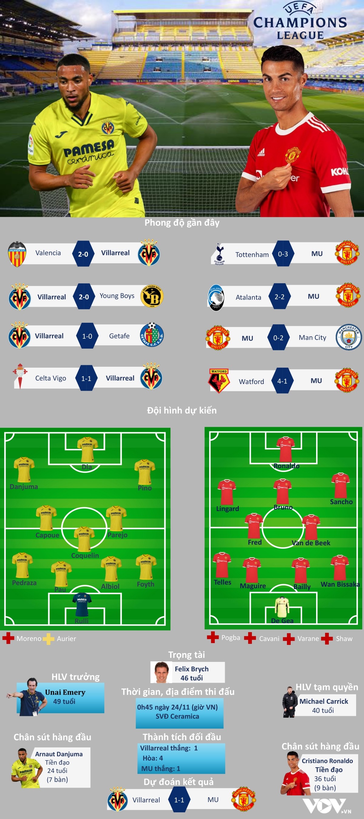 Dự đoán kết quả, đội hình xuất phát trận Villarreal vs MU, lượt trận thứ 5 vòng bảng Champions League diễn ra lúc 0h45 ngày 24/11/2021 trên sân Ceramica, Villarreal, Tây Ban Nha.