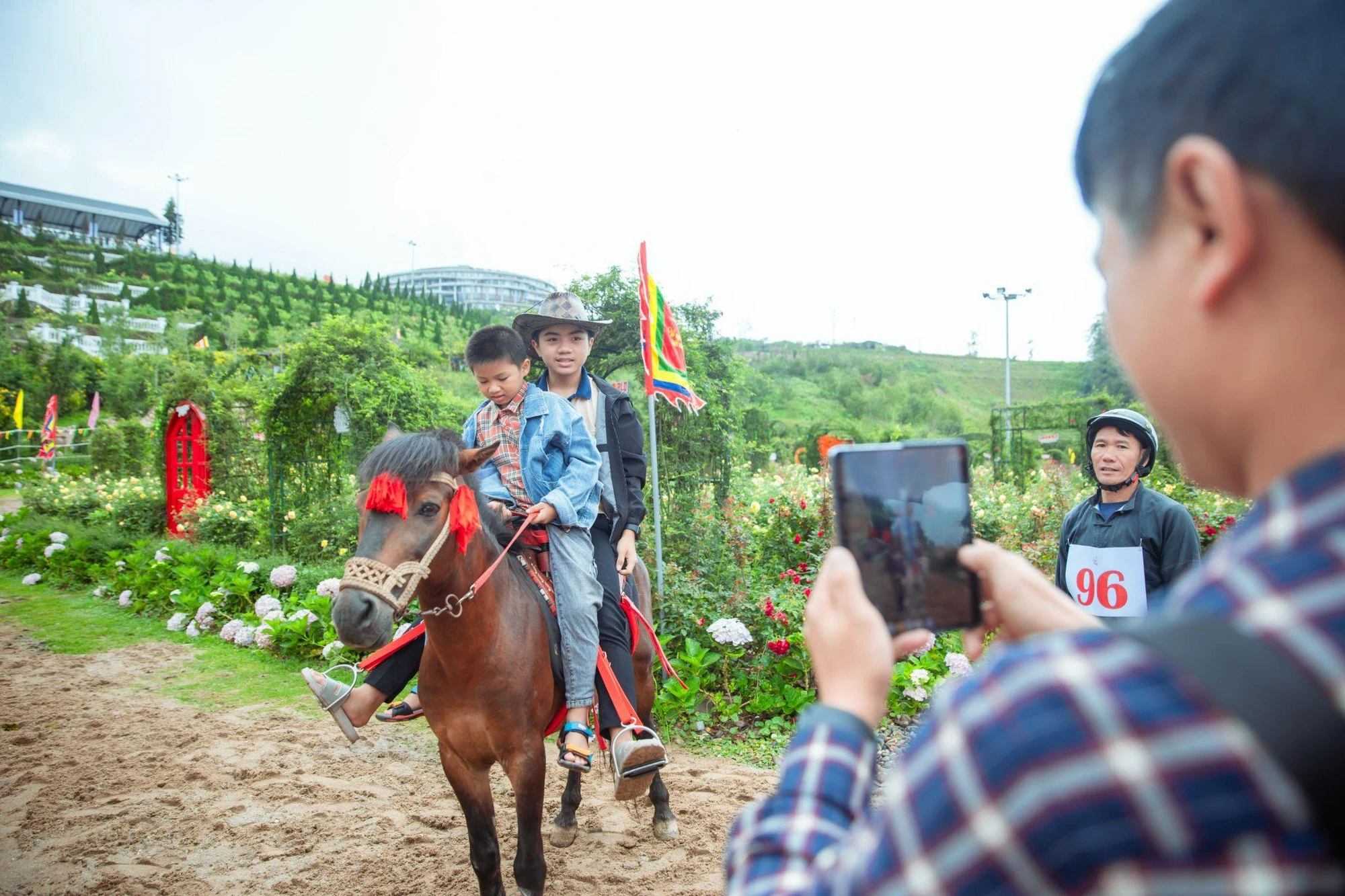 Du khách tham gia trải nghiệm cưỡi ngựa và chụp ảnh tại lễ hội, một trong những hoạt động được yêu thích bên cạnh cuộc đua ngựa.