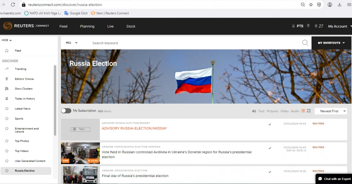 Bầu cử Nga là một sự kiện quan trọng được các hãng truyền thông lớn đặc biệt quan tâm trong những ngày qua. Hãng tin Reuters của Anh đã tạo ra riêng chuyên mục “Bầu cử Nga”, với hình ảnh lá quốc kỳ Nga ở chính giữa ảnh tường. Trong thư mục này, các tin tức về bầu cử Nga được cập nhật liên tục, như tỷ lệ cử tri đi bầu, tình hình bỏ phiếu ở các vùng lãnh thổ mới sáp nhập.