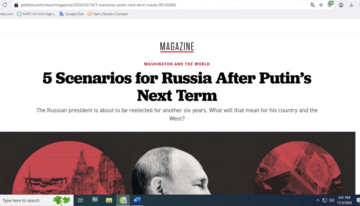 Tờ Politico có bài phân tích sâu nói về 5 kịch bản của nước Nga khi Tổng thống Putin tái đắc cử và điều này có ý nghĩa như thế nào với nước Nga và các nước đối địch phương Tây. Bài viết nhận định Tổng thống Putin vẫn đang chiếm được thiện cảm của người dân Nga khi giúp tình hình kinh tế Nga đứng vững trước “cơn bão trừng phạt” của phương Tây. Cuộc xung đột Nga – Ukraine dù dai dẳng nhưng Nga đang chiếm thế chủ động, còn Mỹ - đồng minh hậu thuẫn số 1 cho Ukraine lại đang “e dè” trong viện trợ.