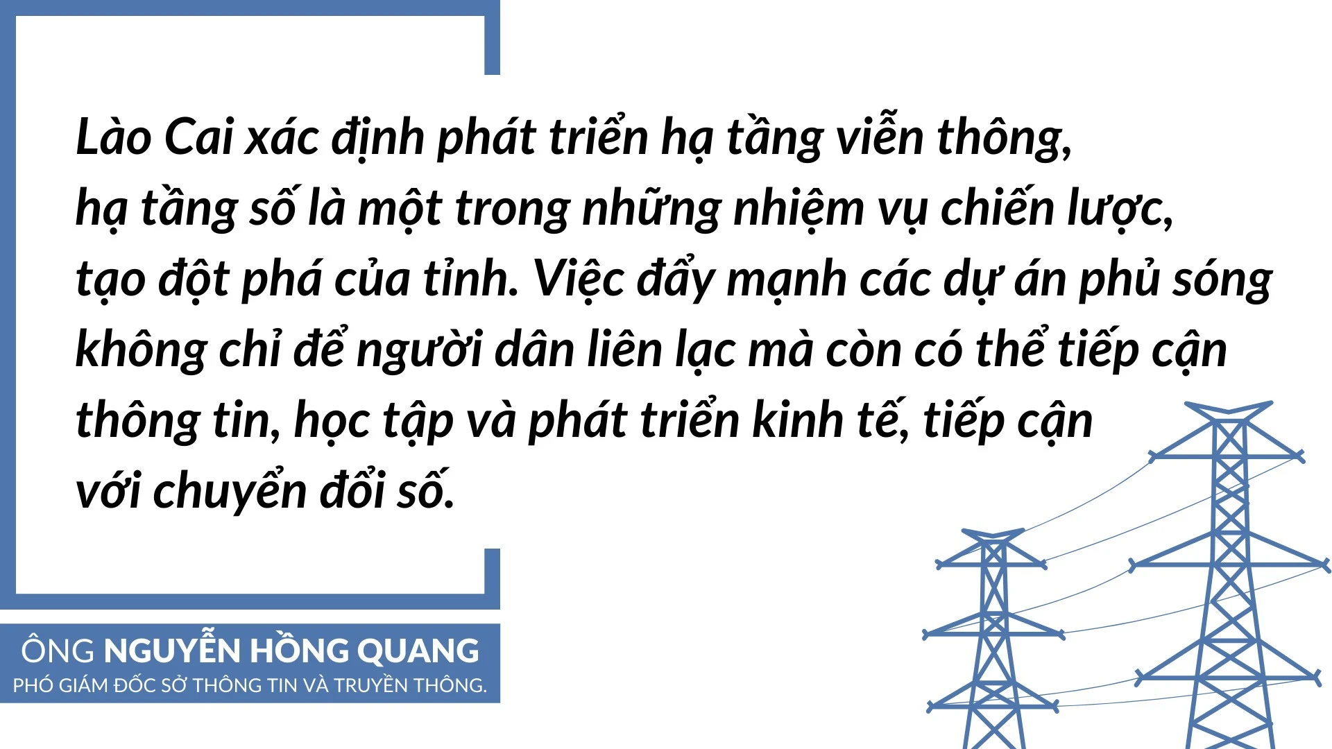 Theo ông Nguyễn Hồng Quang, Phó Giám đốc sở Thông tin và Truyền thông tỉnh, các cơ quan có liên quan sẽ tiếp tục làm việc, đề nghị với Bộ Thông tin và Truyền thông, các tập đoàn viễn thông ưu tiên nguồn lực, thống nhất lộ trình đầu tư để đẩy nhanh tiến độ đầu tư hạ tầng viễn thông, đặc biệt là đối với 8 thôn chưa có hạ tầng internet băng rộng di động, 62 thôn chưa có hạ tầng internet băng rộng cáp quang. Mục tiêu trong năm 2025 là sẽ xóa các thôn, bản “trắng” sóng. Ngoài ra, vẫn còn hơn 60 thôn, bản sóng yếu, chập chờn, Sở đã tham mưu UBND tỉnh ban hành kế hoạch rà soát hạ tầng, dịch vụ truy nhập internet băng rộng, đánh giá chất lượng dịch vụ để có những phương án điều chỉnh hoặc yêu cầu các đơn vị viễn thông đầu tư nâng cấp phù hợp với điều kiện thực tế.