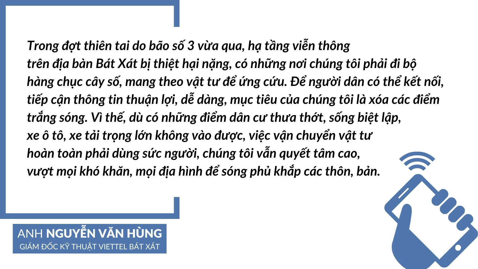 Huyện Bát Xát hiện có hơn 70 trạm thu phát sóng (BTS). Những năm qua, số trạm được mở rộng, không chỉ để phủ sóng di động, mà còn phục vụ đường truyền internet tốc độ cao giúp người dân kết nối, sử dụng các tiện ích số. Thế nhưng, theo anh Hùng, việc đưa sóng vào những bản làng xa xôi chẳng dễ dàng. Đôi khi, sóng không chỉ là vấn đề về kỹ thuật. Những cơn mưa, những trận lũ quét hay bản làng biệt lập, phương tiện giao thông không thể di chuyển khiến công việc của anh và đồng nghiệp thêm phần gian nan.
