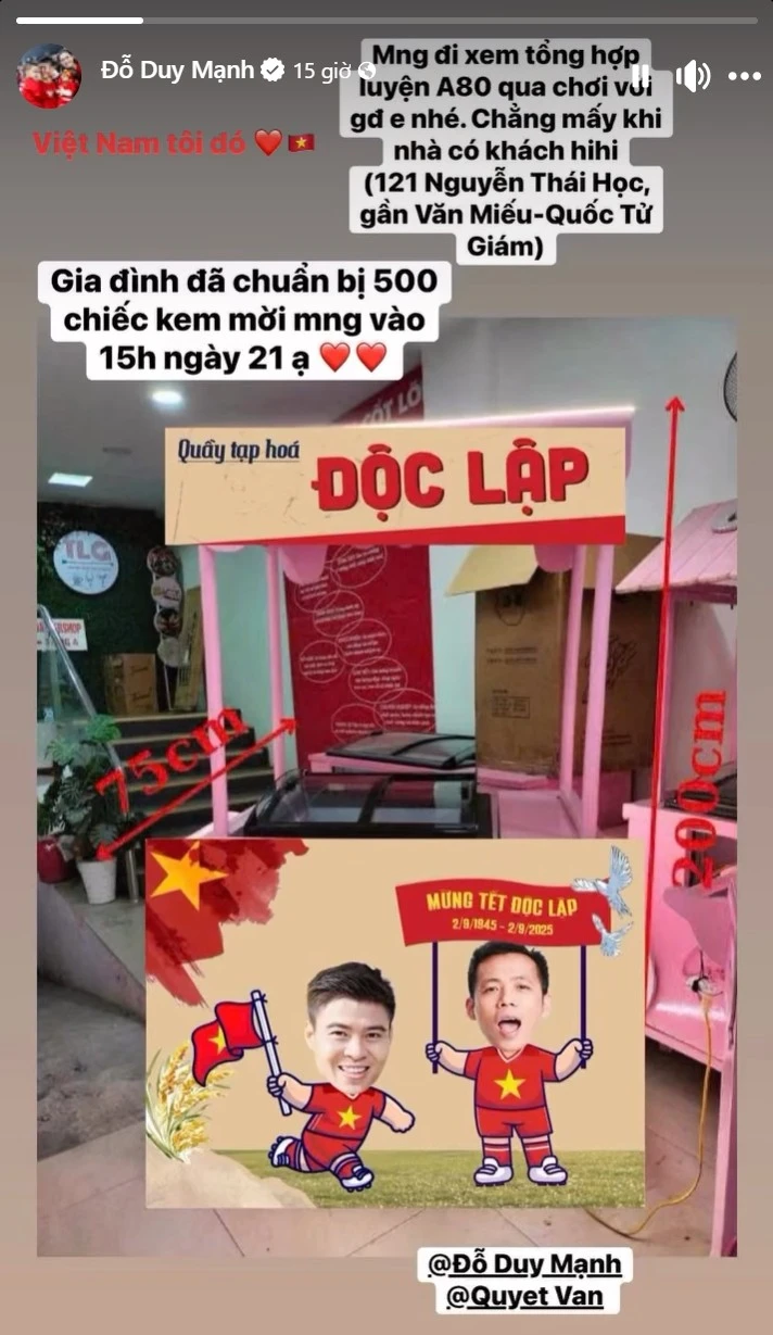 Trên trang cá nhân, trung vệ Duy Mạnh cũng chia sẻ story với nội dung tương tự, hoan nghênh mọi người đến để theo dõi buổi buổi tổng hợp luyện chuẩn bị cho đại lễ A80.