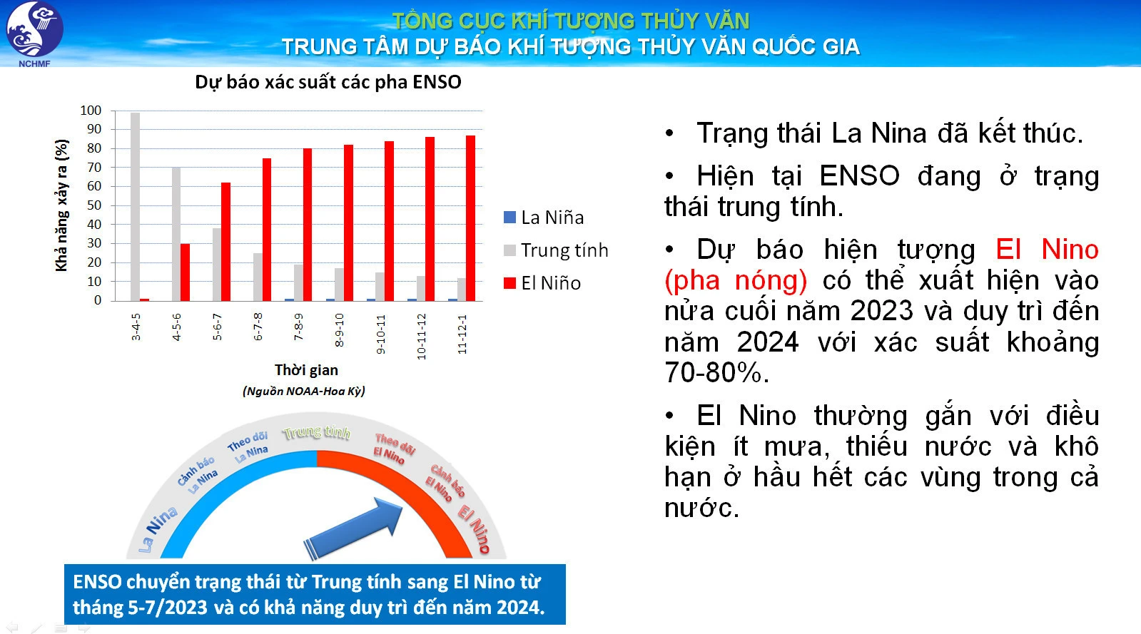 Dự báo hiện tượng El Nino có khả năng sẽ xuất hiện vào cuối tháng 5, đầu tháng 6/2023 với xác suất khoảng 70-80% và có thể kéo dài sang đầu năm 2024.
