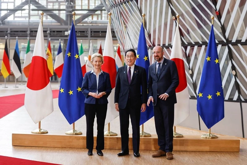 Phát biểu tại cuộc họp báo sau cuộc gặp với Chủ tịch Hội đồng Châu Âu Charles Michel và Chủ tịch Ủy ban Châu Âu Ursula von der Leyen, Thủ tướng Nhật Bản Fumio Kishida cho biết: “Chúng tôi hoan nghênh việc EU tăng cường mở rộng quan hệ với các nước tại khu vực Ấn Độ Dương-Thái Bình Dương”.