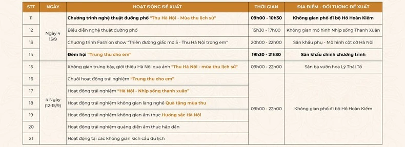 Các hoạt động sẽ được diễn ra trong 4 ngày, thời gian hoạt động diễn ra từ 9 giờ tới 22 giờ (ngày 12-15/9) để phục vụ du khách và người dân Thủ đô. Festival Thu Hà Nội 2024 đem tới cho du khách tham quan hơn 20 hoạt động trải nghiệm. Bên cạnh đó các không gian được bố trí thành các khu vực riêng, tạo điểm nhấn, có sự liên kết, nhằm nổi bật lên chủ đề năm nay "Thu Hà Nội - Mùa thu lịch sử".