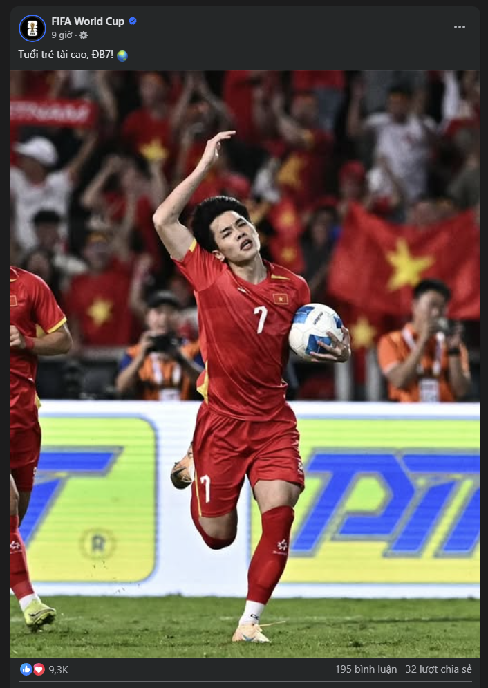 Cụ thể, fanpage FIFA World Cup sử dụng hình ảnh Đình Bắc ăn mừng bàn thắng rút ngắn tỷ số 1-2 trong trận chung kết bóng đá nam SEA Games 33 để đăng tải, kèm dòng trạng thái bằng tiếng Việt: ‘Tuổi trẻ tài cao, ĐB7!’. Bài viết nhanh chóng thu hút hàng nghìn lượt tương tác, bình luận và chia sẻ từ người hâm mộ Việt Nam, cho thấy sức lan tỏa lớn của khoảnh khắc này.