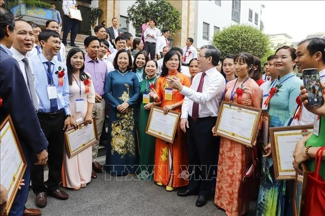 Chủ tịch Trung ương Hội Nông dân Việt Nam Lương Quốc Đoàn nói chuyện với các nông dân Việt Nam xuất sắc. Ảnh: TTXVN phát