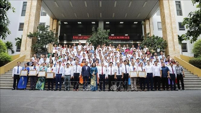 Lãnh đạo Trung ương Hội Nông dân Việt Nam chụp ảnh cùng các nông dân Việt Nam xuất sắc. Ảnh: TTXVN phát