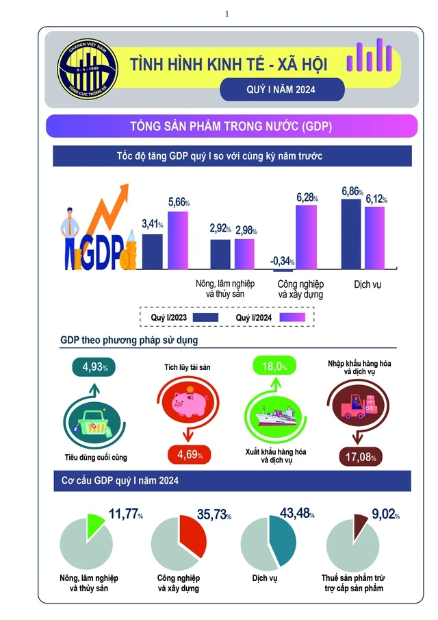 Về sử dụng GDP quý I/2024, tiêu dùng cuối cùng tăng 4,93% so với cùng kỳ năm trước, đóng góp 56,77% vào tốc độ tăng chung. Tích lũy tài sản tăng 4,69%, đóng góp 24,07%. Xuất khẩu hàng hóa và dịch vụ tăng 18%. Nhập khẩu hàng hóa và dịch vụ tăng 17,08%, chênh lệch xuất, nhập khẩu hàng hóa và dịch vụ đóng góp 19,16%.