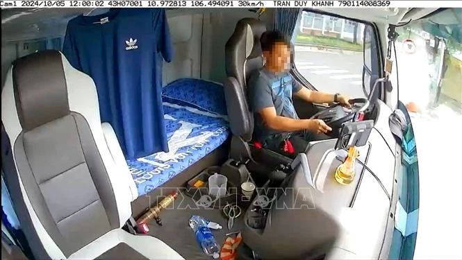 Vụ tai nạn xe ô tô đầu kéo biển số 43H-070.01 kéo rơ móc biển số 43RM-005.15 lưu thông trên đường Tỉnh lộ 8, hướng từ tỉnh Bình Dương đi Củ Chi (Thành phố Hồ Chí Minh) có liên quan đến các thiết bị nghe, nhìn. Ảnh: TTXVN phát