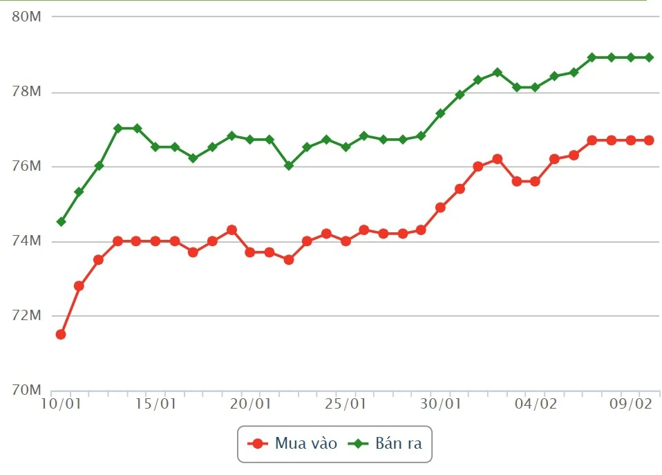 Trong khi đó, Công ty VBĐQ Sài Gòn SJC niêm yết, giá vàng mua vào 76,7 triệu đồng/lượng; giá bán ra là 78,9 triệu đồng/lượng.