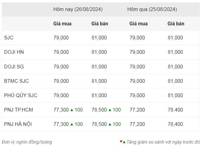 Tại thời điểm 8 giờ 30 phút sáng 26/8, giá vàng miếng DOJI tại Hà Nội và Thành phố Hồ Chí Minh niêm yết ở mức 79 triệu đồng/lượng mua vào và 81 triệu đồng/lượng bán ra. Thương hiệu này niêm yết giá vàng nhẫn Doji Hưng Thịnh Vượng 9999 mua vào-bán ra ở mức 77,3-78,5 triệu đồng/lượng, tăng 100.000 đồng so kết phiên trước đó.