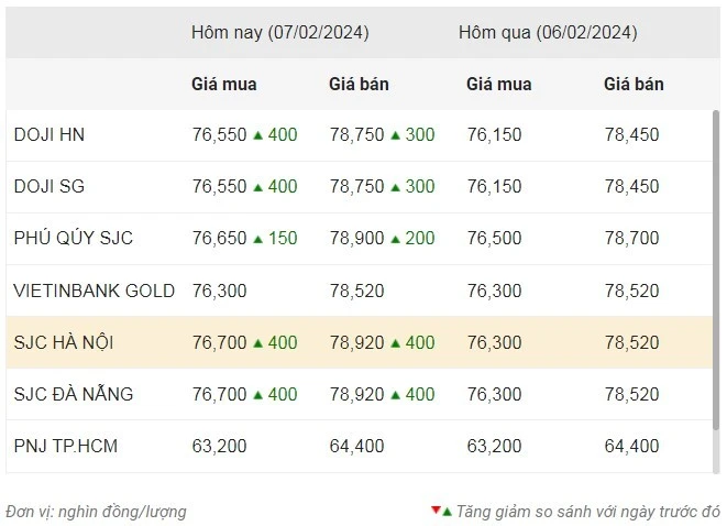 Tính đến 9 giờ 30 phút ngày 7/2, giá vàng DOJI tại Hà Nội và Thành phố Hồ Chí Minh niêm yết ở mức 76,55 triệu đồng/lượng mua vào và 78,75 triệu đồng/lượng bán ra, tăng 300.000 đồng so kết phiên hôm qua. Chênh lệch mua vào-bán ra ở mức cao 2,2 triệu đồng/lượng.