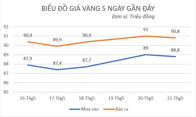 Tính đến 8h35 ngày 21/5, giá vàng miếng được SJC niêm yết ở mức 88,8 - 90,8 triệu đồng/lượng mua vào - bán ra, giảm 200.000 đồng/lượng ở cả hai chiều so với chốt phiên hôm trước.