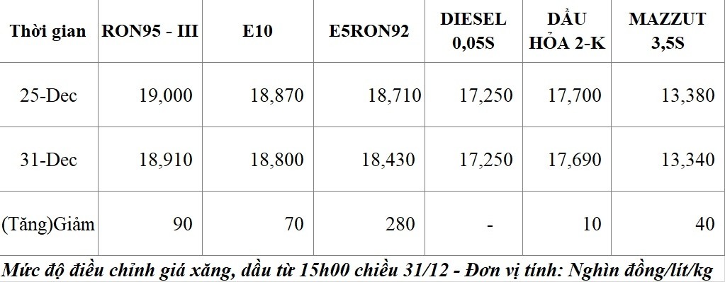 Giá xăng dầu mới được liên Bộ Công Thương - Tài chính thông báo điều chỉnh từ 15h00 chiều nay (31/12). Theo đó, giá xăng RON95-III là 18.910 đồng/lít, giảm 90 đồng/lít; Giá xăng E10 là 18.800 đồng/lít, giảm 70 đồng/lít; Giá xăng E5RON92 là 18.430 đồng/lít, giảm 280 đồng/lít.