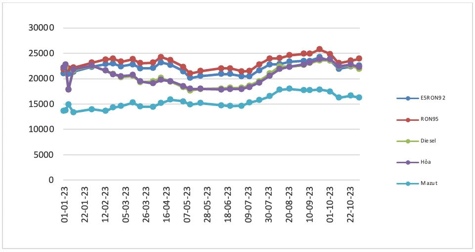 Biến động giá bán lẻ xăng dầu trong nước từ 01/01/2023 đến 01/11/2023.