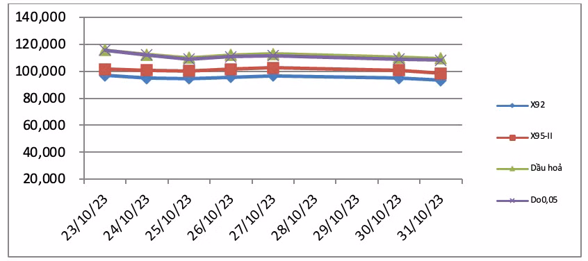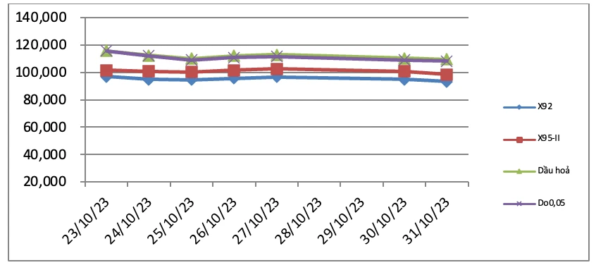 Bình quân giá thành phẩm xăng dầu thế giới giữa kỳ điều hành giá ngày 23/10/2023 và kỳ điều hành ngày 01/11/2023 là: 95,246 USD/thùng xăng RON92 dùng để pha chế xăng E5RON92 (tăng 1,226 USD/thùng, tương đương tăng 1,30% so với kỳ trước); 100,806 USD/thùng xăng RON95 (tăng 1,858 USD/thùng, tương đương tăng 1,88% so với kỳ trước); 111,801 USD/thùng dầu hỏa (giảm 3,039 USD/thùng, tương đương giảm 2,65% so với kỳ trước); 110,869 USD/thùng dầu điêzen (giảm 3,620 USD/thùng, tương đương giảm 3,16% so với kỳ trước); 475,959 USD/tấn dầu mazut 180CST 3,5S (giảm 15,360 USD/tấn, tương đương giảm 3,13% so với kỳ trước).