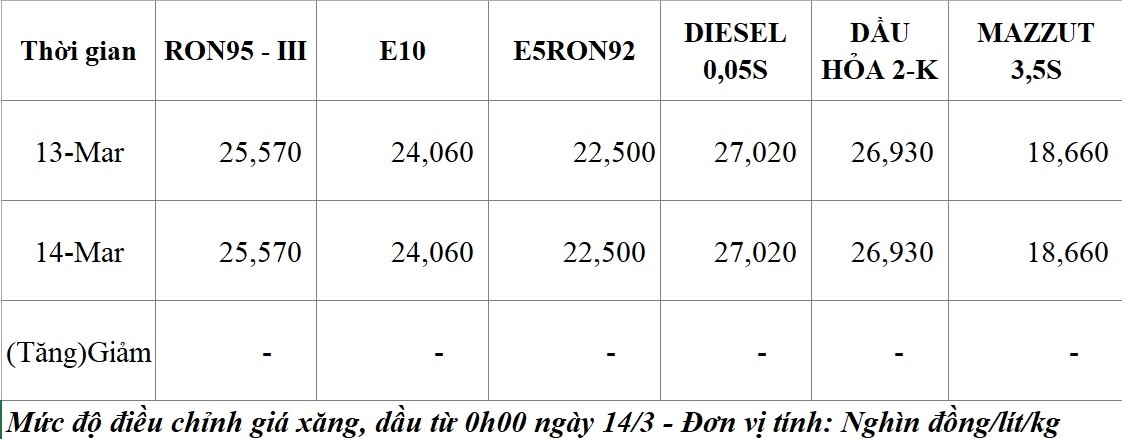 Tại kỳ điều hành tối 13/3, giá xăng RON95-III là 25.570 đồng/lít; Giá xăng E10 là 24.060 đồng/lít; giá xăng E5RON92 là 22.500 đồng/lít; Giá dầu diesel 0.05S là 27.020 đồng/lít; Giá dầu hỏa là 26.930 đồng/lít; Giá dầu mazut 180CST 3.5S kỳ này là 18.660 đồng/kg.