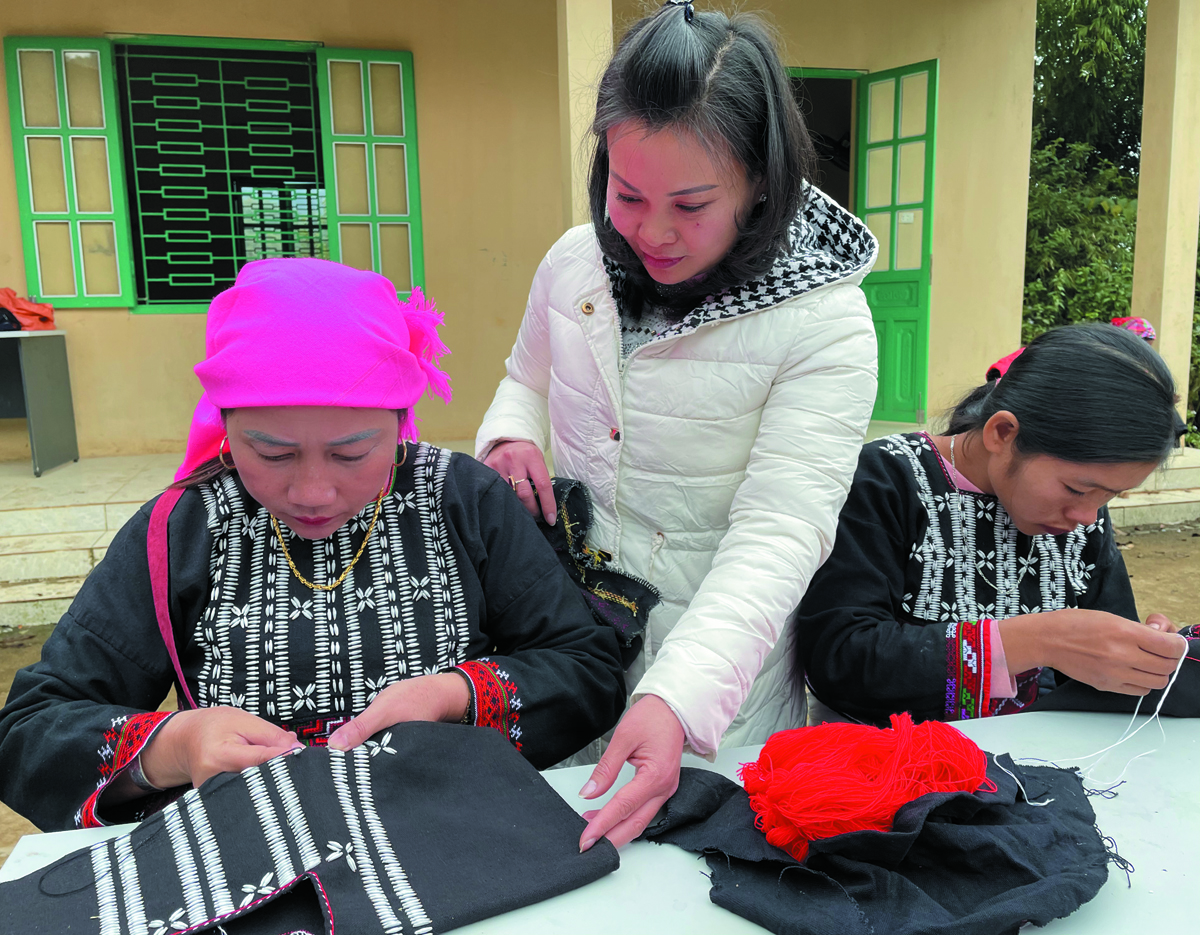 Chị Cung Thanh Mai hướng dẫn bà con Xa Phó thêu mẫu thổ cẩm mới.