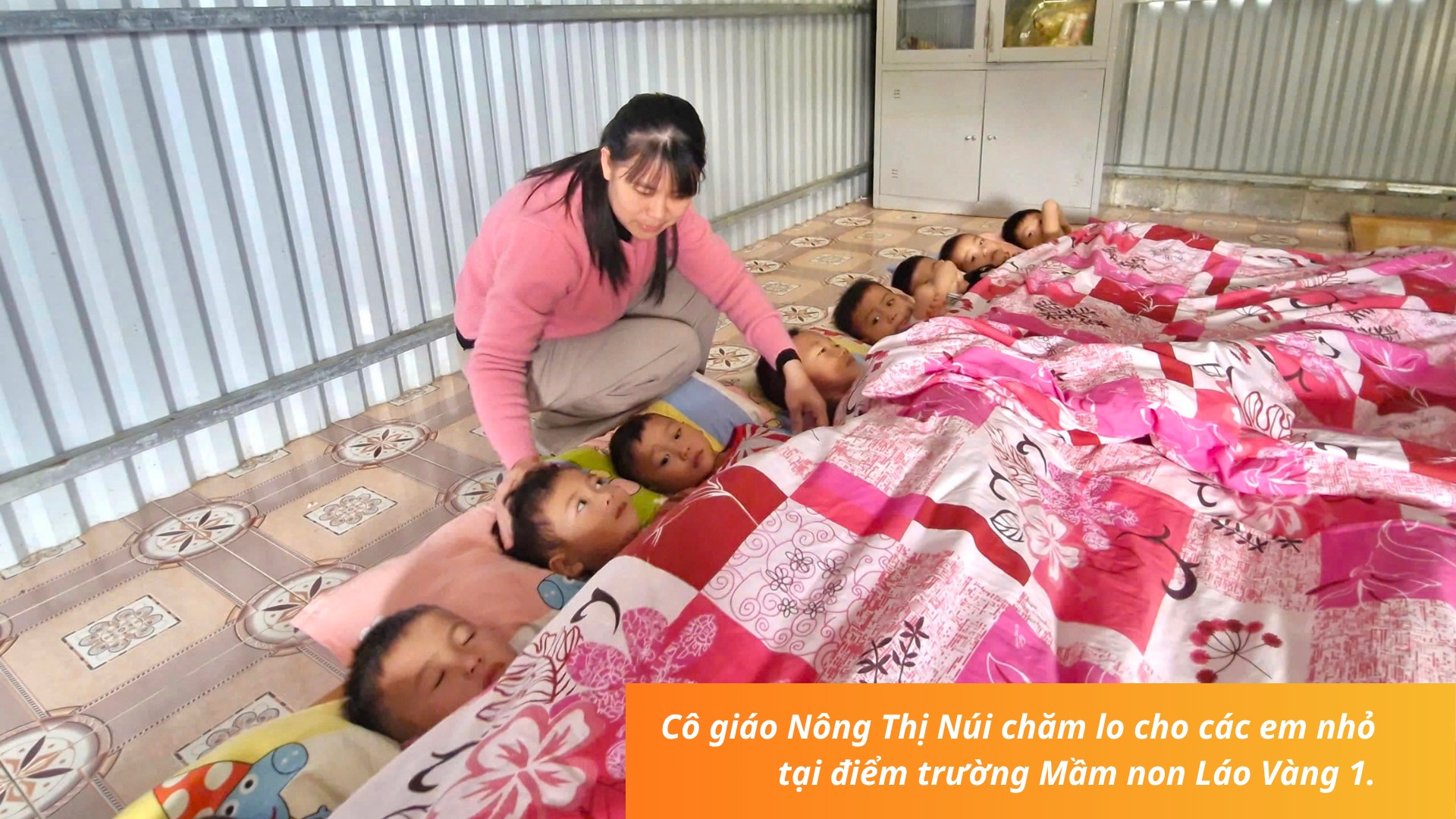 Buổi trưa, mặc dù trời đã hửng nắng nhưng vẫn không xua được cái lạnh tràn đến theo từng cơn gió dưới chân núi Ngũ Chỉ Sơn. Sau bữa cơm trưa, các cô giáo ở điểm trường Mầm non Láo Vàng 1 cho học sinh vào lớp ngủ. Những bức tường quây bằng tôn mỏng màu xanh dường như làm cho căn phòng nhỏ lạnh hơn. Cô giáo Núi lấy thêm chăn đắp cho từng học sinh. Mong rằng, giấc mơ của các em về một ngôi trường mới thật đẹp trên núi Láo Vàng sẽ sớm thành hiện thực.