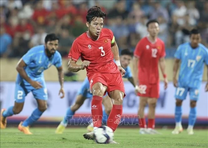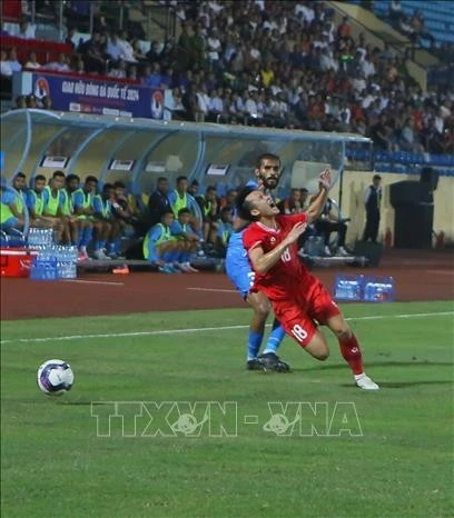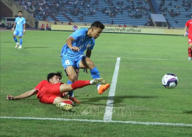 Tình huống tranh chấp bóng giữa cầu thủ đội tuyển Việt Nam (áo đỏ) và cầu thủ tuyển Ấn Độ. Ảnh: Công Luật/TTXVN