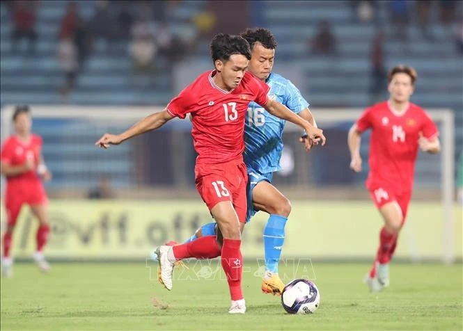 Pha lên bóng của cầu thủ Bùi Vĩ Hào (số 13, Việt Nam). Ảnh: TTXVN