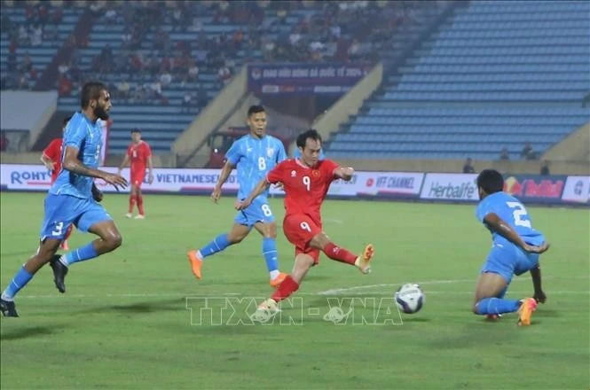 Cầu thủ Văn Toàn sút bóng trước vòng vây của các cầu thủ tuyển Ấn Độ. Ảnh: Công Luật/TTXVN