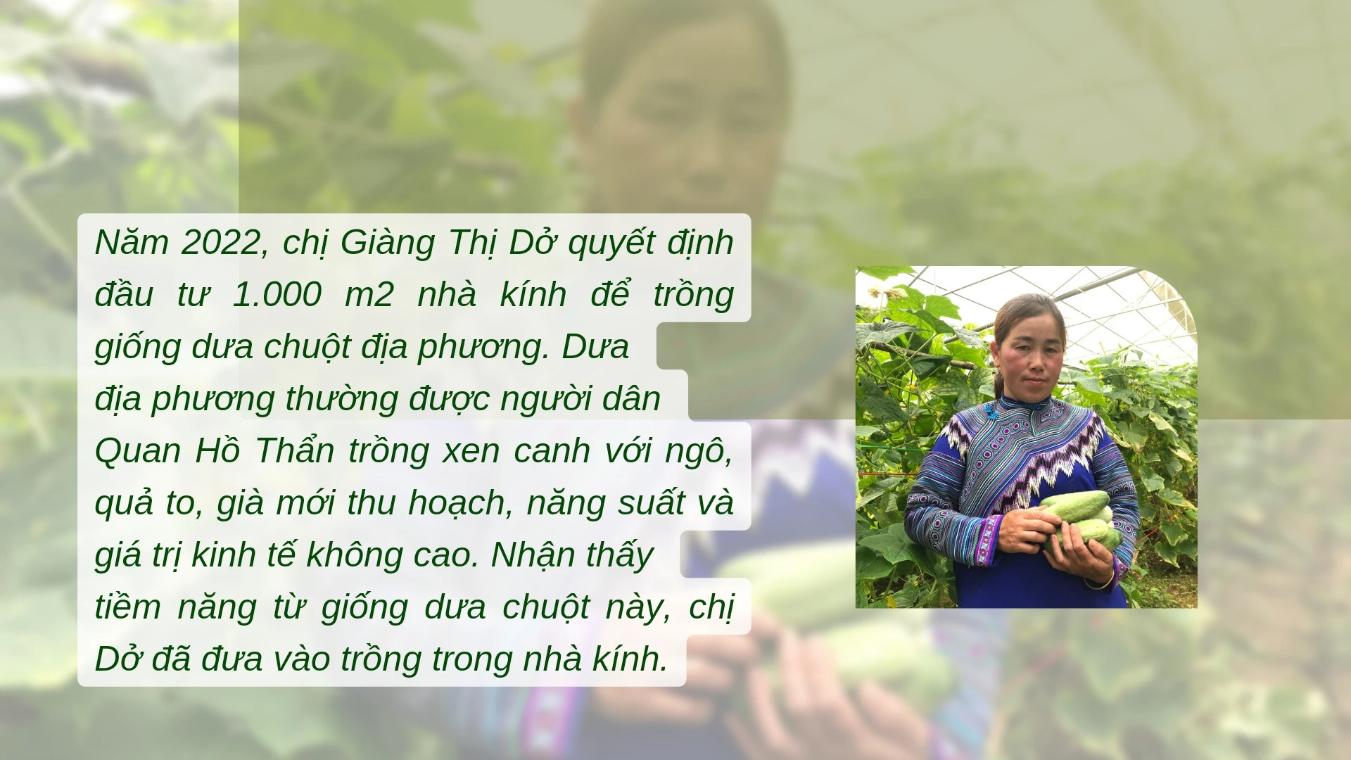 Năm 2022, chị Giàng Thị Dở quyết định đầu tư 1.000 m2 nhà kính để trồng giống dưa chuột địa phương. Dưa địa phương thường được người dân Quan Hồ Thẩn trồng xen canh với ngô, quả to, già mới thu hoạch, năng suất và giá trị kinh tế không cao. Nhận thấy tiềm năng từ giống dưa chuột này, chị Dở đã đưa vào trồng trong nhà kính.