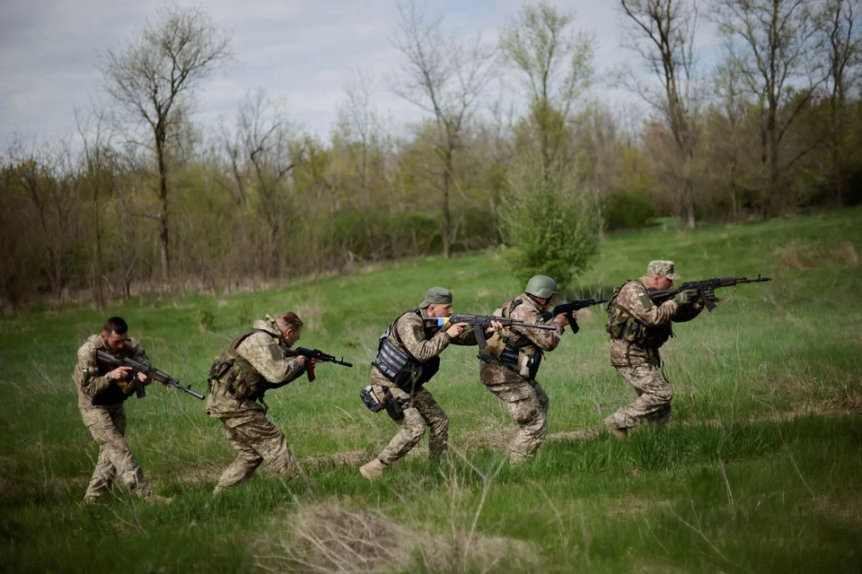 Binh sĩ Ukraine tập trận chiến thuật tại một doanh trại quân sự hồi tháng 4/2022. Ảnh: Reuters