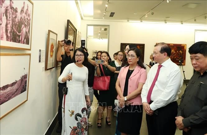 Thứ trưởng Bộ Văn hóa, Thể thao và Du lịch Tạ Quang Đông và các đại biểu tham quan triển lãm. Ảnh: Quốc Khánh/TTXVN