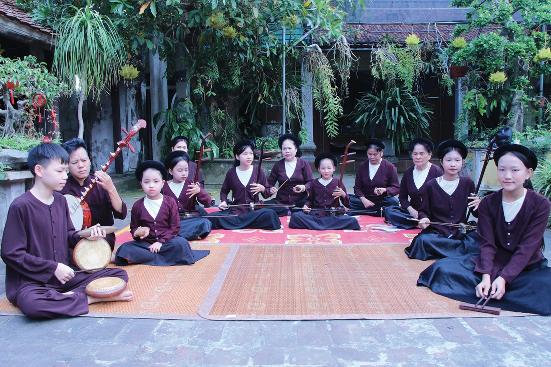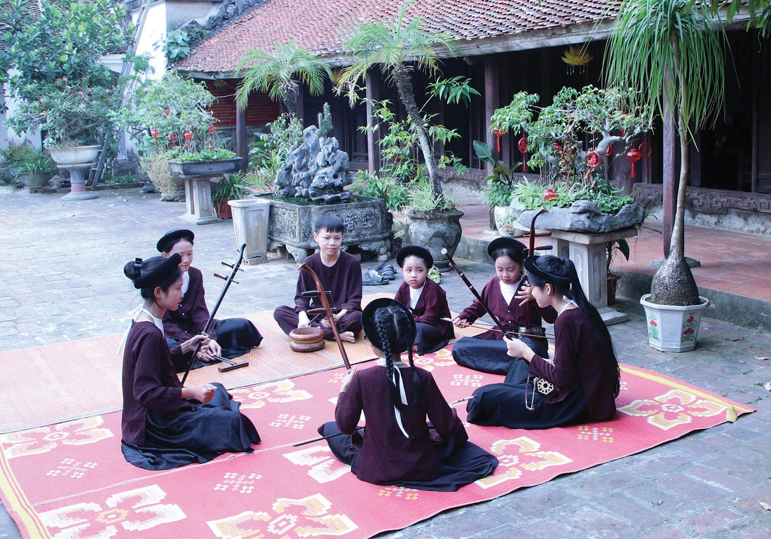 Bốn manh chiếu được trải, hơn chục người, lớn nhất 74 tuổi, trẻ nhất mới 7 tuổi, người kéo đàn, người gõ phách say sưa tập hát.