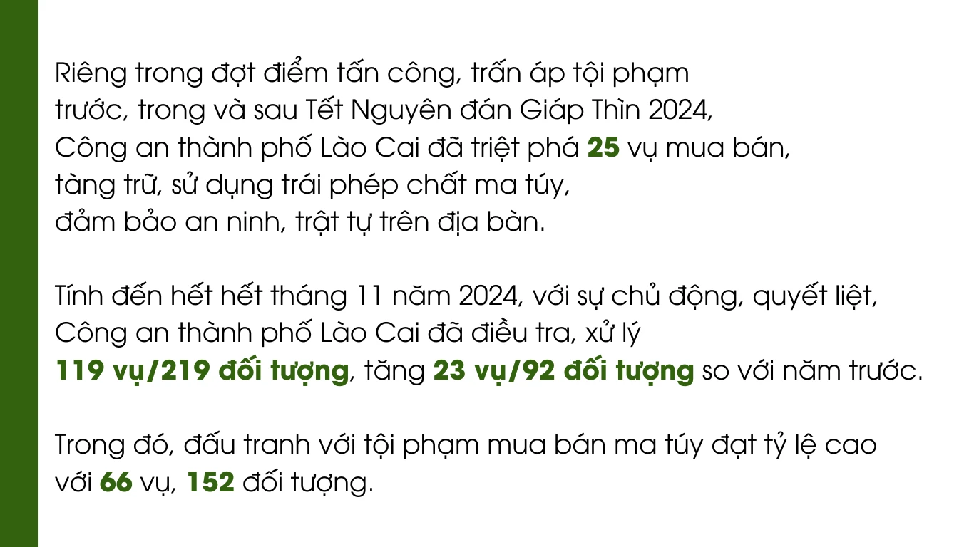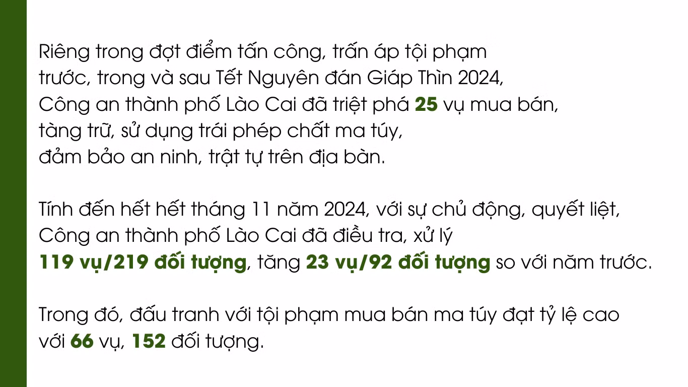 Trong đó, công an một số địa phương như thành phố Lào Cai, huyện Bát Xát, huyện Văn Bàn đã lập nhiều chiến công trong truy quét tội phạm ma túy. Nhờ đó đã cơ bản triệt phá, bóc gỡ các tụ điểm, điểm bán lẻ ma túy, quét sạch các đối tượng mua bán ma túy trái phép, đưa hàng trăm người nghiện ma túy đi cai nghiện bắt buộc. Mùa xuân mới năm nay, công tác phòng chống, đấu tranh với tội phạm ma túy sẽ được tăng cường, từ phố phường đến các bản làng vùng cao, biên giới để Nhân dân yên tâm vui xuân, đón Tết Ất Tỵ 2025.