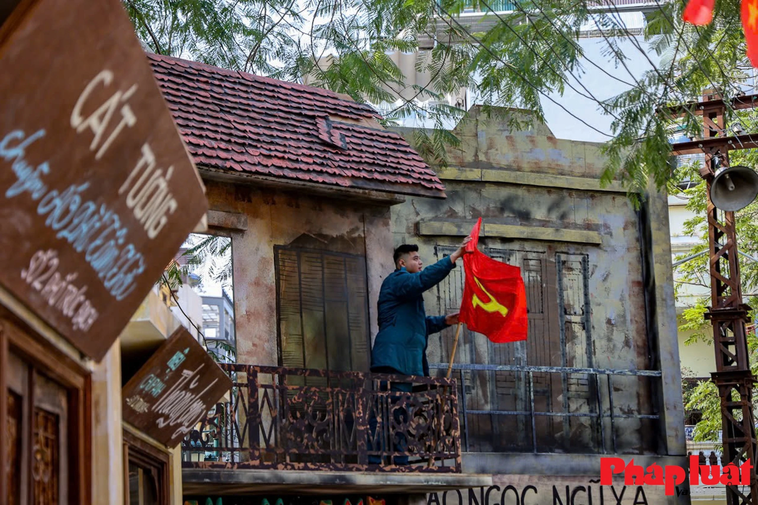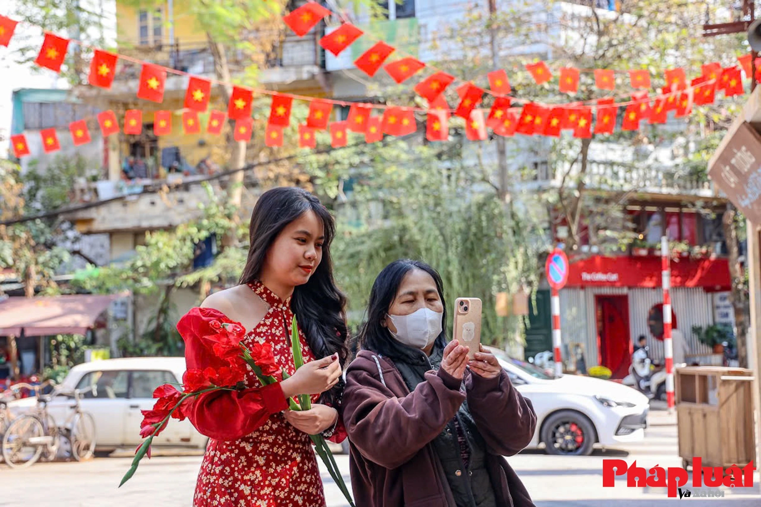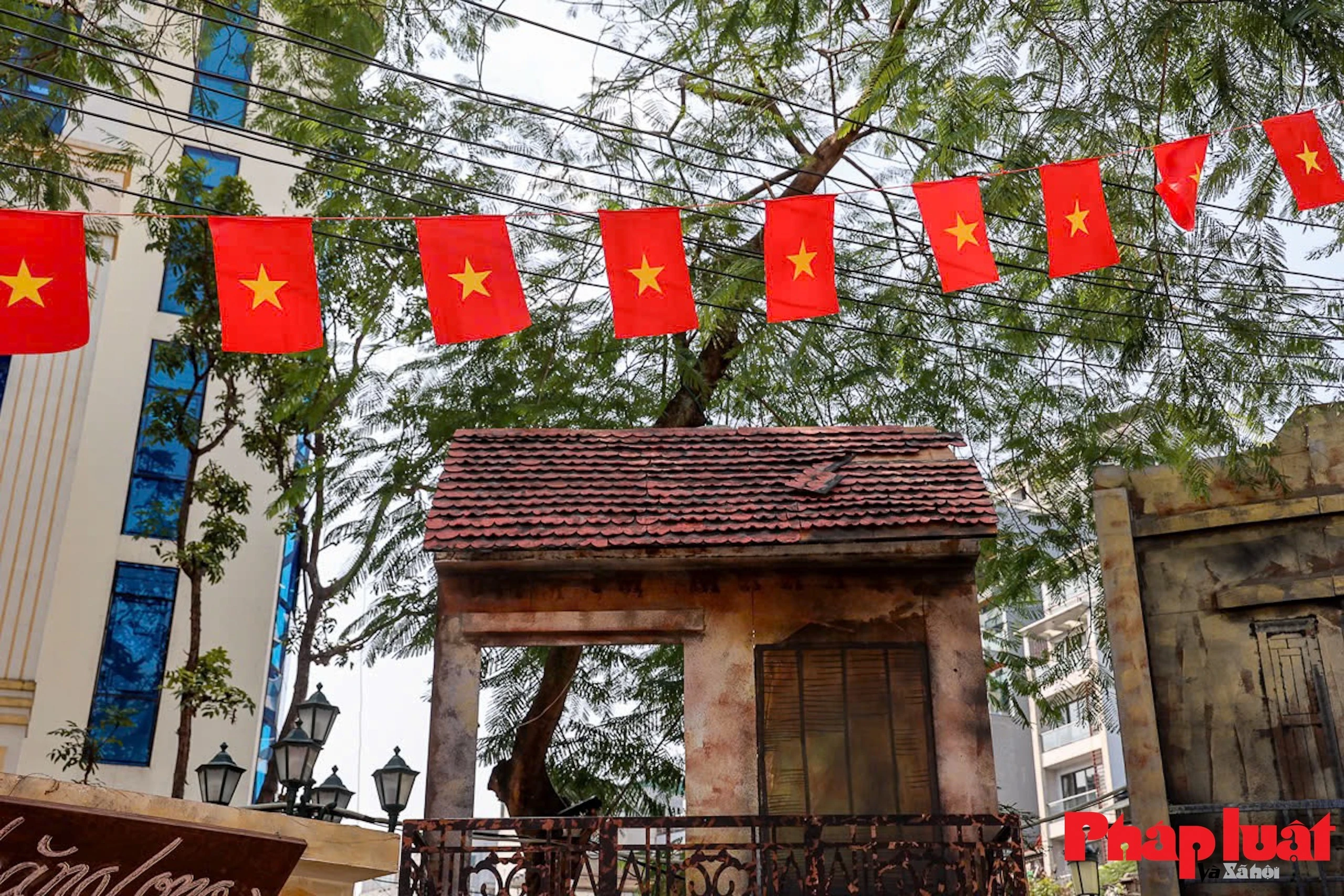 Người Hà Nội treo cờ trên ban công trước nhà để chuẩn bị đón Tết.